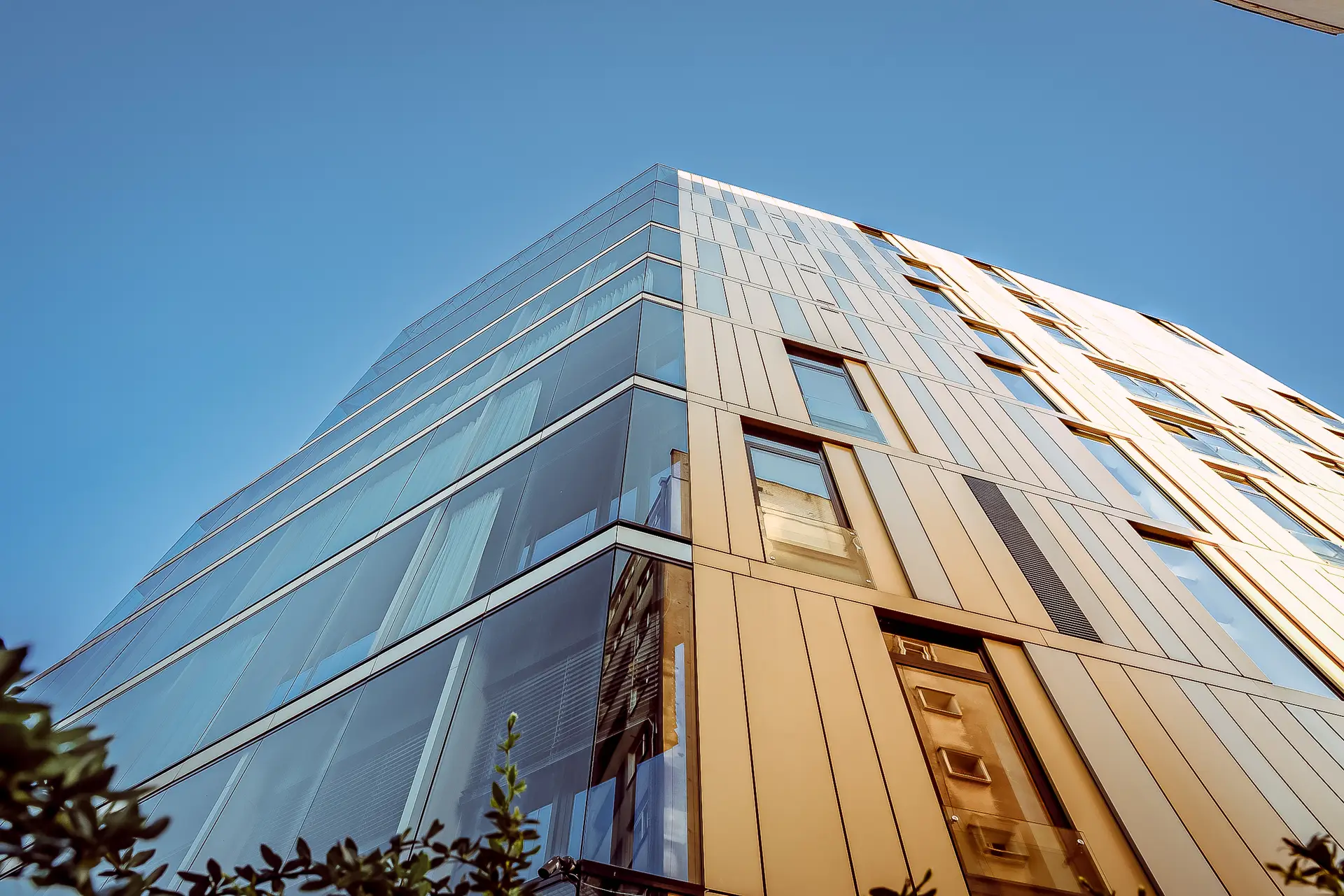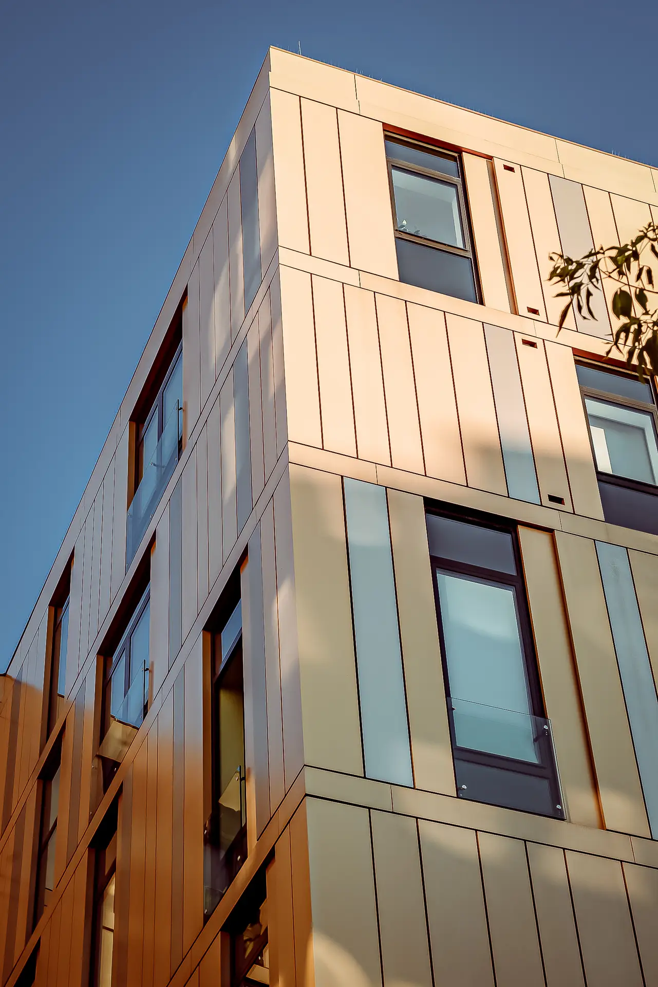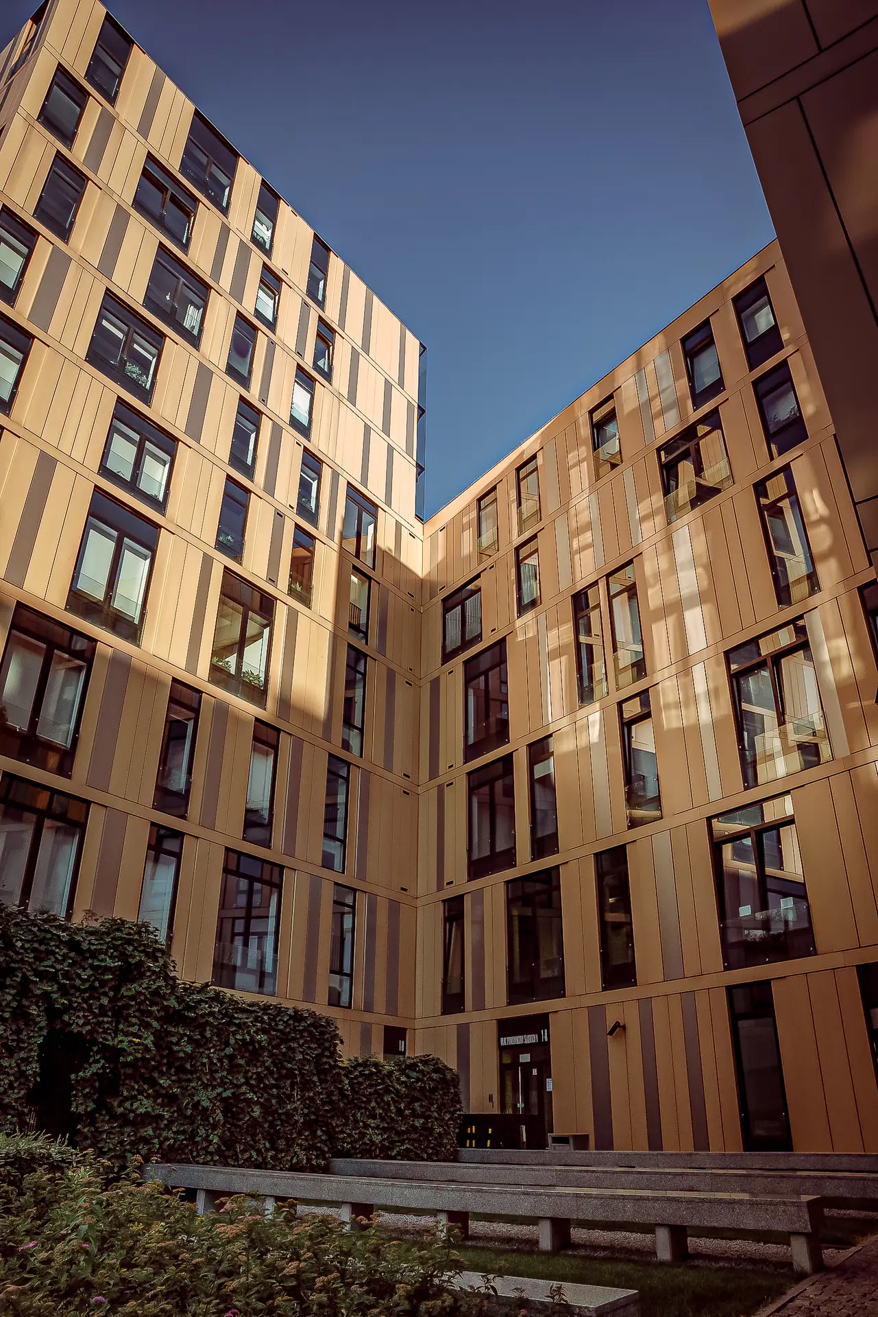 Intencje projektantów w kaskadowym kształtowaniu bryły są tu klarowne i podkreślone wysoką jakością wykończenia. Neomodernistyczny kostium naszego thespiana uszyto ze złocistych i srebrzystych płyt elewacyjnych. W celu zapewnienia ciszy i komfortu apartamenty odizolowano od ruchliwej ulicy dwiema warstwami okiennych przeszkleń. Między nimi wstawiono przesłony ze zdalnie przesuwnych tkanin. Ten wysmakowany architektoniczny teatr ma zatem nawet swoje kurtyny.